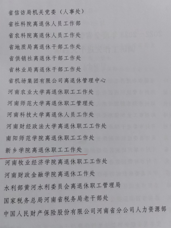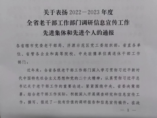 近日,中共河南省委老干部局下发豫老文〔2023〕90号文件,表扬2022--2023年度全省老干部工作部门调研信息宣传工作先进集体和先进个人。威尼斯官网因成绩突出,荣获全省老干部工作部门信息宣传工作先进集体。