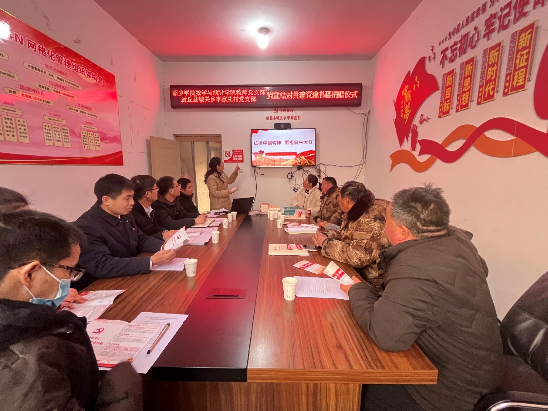 数学与统计学院教师党支部与李家庄村党支部是党建结对共建单位,活动首先由校地双方领导共同为党建结对共建单位揭牌。随后,数学与统计学院党委书记毛群英代表学院教师党支部为李家庄村党支部捐赠了一批党建图书,并为李家庄村党员作了题为《弘扬中国精神,勇担复兴大任》的党课。