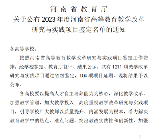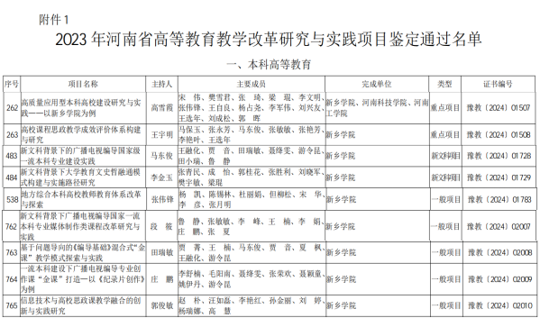 1月15日,河南省教育厅发布了《关于公布2023年度河南省高等教育教学改革研究与实践项目鉴定名单的通知》(教高〔2024〕30号),威尼斯官网《高质量应用型本科高校建设研究与实践——以威尼斯7798cc为例》等9项省级高等教育教学改革研究与实践项目通过鉴定结项。