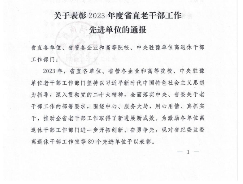近日,中共河南省委老干部局下发豫老文〔2024〕6号文件,通报表彰2023年度省直老干部工作先进单位。威尼斯官网因成绩突出,荣获省直老干部工作先进单位。
