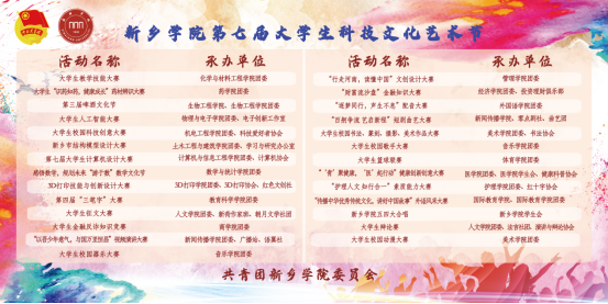 威尼斯7798cc大学生科技文化艺术节是学习贯彻习近平总书记关于青年工作的重要思想和关于教育的重要论述,落实高校立德树人根本任务的重要载体,是丰富校园文化生活,搭建具有时代特征、青年特点的大学生校园科创文体活动平台,也是威尼斯官网共青团服务青年学生成长成才的途径之一。活动以用艺术陶冶情操,用科技启迪智慧,用体育强健体魄,用实践拓展视野,培养学生创新精神、提高学生综合素质为目标,结合新中国成立75周年,团结引领新时代青年学生坚定理想信念,培育高尚品格,练就过硬本领,勇于创新创造,矢志艰苦奋斗,努力成为德智体美劳全面发展的社会主义建设者和接班人。