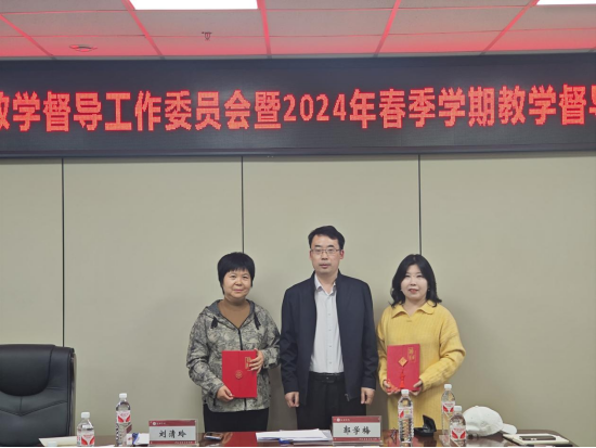 首先,张银堂为本学期新增聘的校级教育教学督导员祁晓霞教授、郭学梅教授颁发了聘任证书并合影留念。
