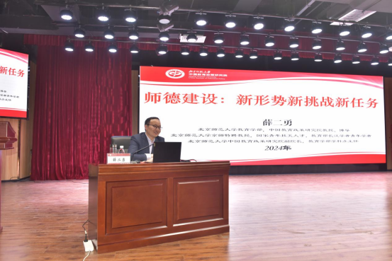 会议第二阶段邀请教育部青年长江学者、北京师范大学京师特聘教授、中国教育政策研究院副院长薛二勇教授作师德师风建设专题报告。报告会由杨钧主持。