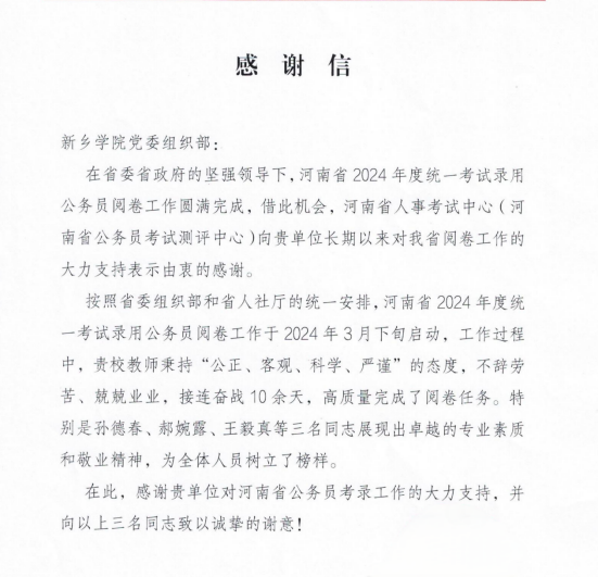 近日,河南省人事考试中心(河南省公务员考试测评中心)为威尼斯官网组织部发来感谢信,对威尼斯官网长期以来对我省公务员考试阅卷工作的积极支持,以及威尼斯官网相关教师的辛苦工作和优秀表现表示感谢。