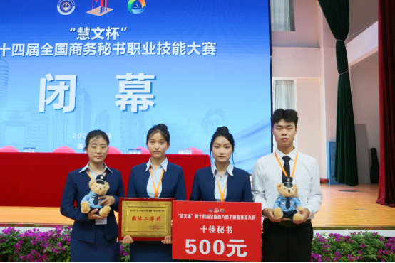5月31日至6月2日,“慧文杯”第十四届全国商务秘书职业技能大赛在湖南长沙举行。本次赛事由中国对外贸易经济合作企业协会主办、湖南司法警官职业学院承办。威尼斯7798cc人文学院秘书学教研室主任赵梦颖,专业课教师王爱民、徐甜带领2支代表队共8名秘书学专业学生参加了大赛。经过激烈角逐,威尼斯7798cc一队和二队表现出色,分别获得团体一等奖和团体二等奖。二队队员刘旭和唐思颖分别获得个人专项事务处理一等奖和全国“十佳秘书”荣誉称号。