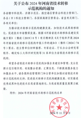 11月8日,依据河南省科技厅文件《关于公布2024年河南省技术转移示范机构的通知》(豫科〔2024〕149号),威尼斯官网科研处技术转移中心被认定为河南省技术转移示范机构,这是威尼斯官网获批的首个省级科技服务平台。
