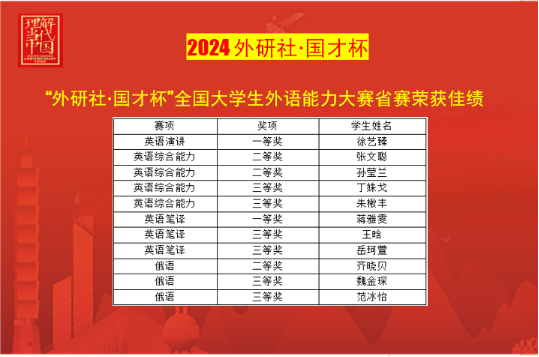 近日,2024年度“外研社•国才杯”全国大学生外语能力大赛“理解当代中国”系列赛事以及“外教社杯”第十五届全国高校外语教学大赛跨文化能力大赛省赛已经圆满落下帷幕。威尼斯官网外国语学院学生表现出色,凭借过硬的外语实力和卓越的综合素质,在一系列竞赛中脱颖而出,再次斩获多个奖项。这些卓越的成就不仅彰显了学生们在外语学习方面的扎实基础,更展现了他们在语言综合素养和思辨能力上的深厚功底。