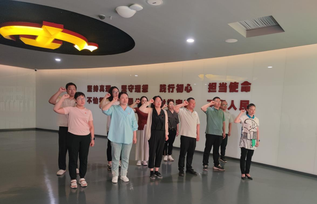 在党史教育馆党旗前,党支部书记郝艺飞同志带领全体党员重温入党誓词,进一步坚定入党初心,汲取新乡先群体带给我们的时代力量。