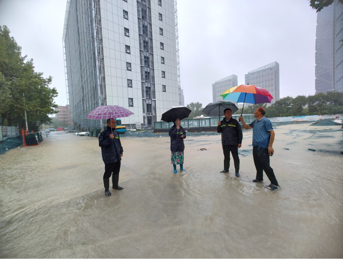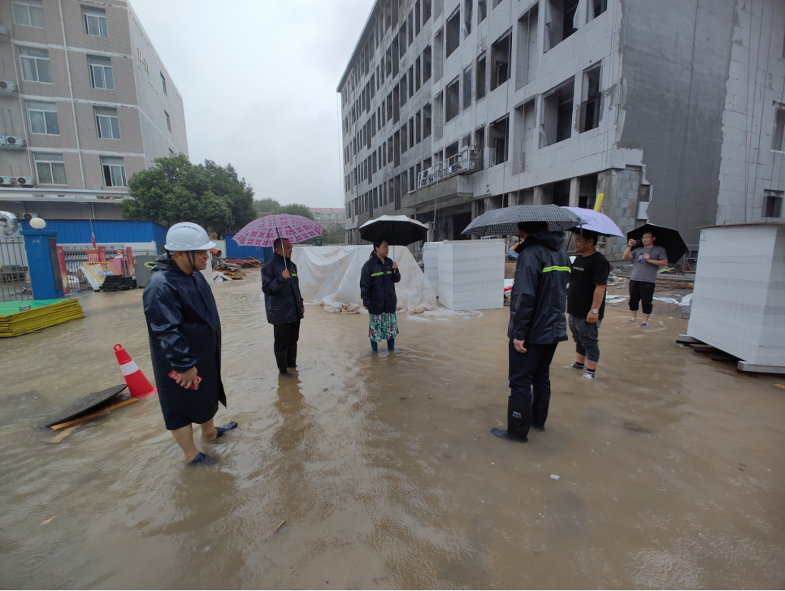 7月17日上午,基建处党支部书记郭兵、处长黄家骏、副处长李伟,冒雨带领相关管理人员检查学校在建工程项目防汛工作。