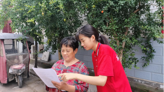 图为实践团成员为老奶奶普及黄河流域生态知识