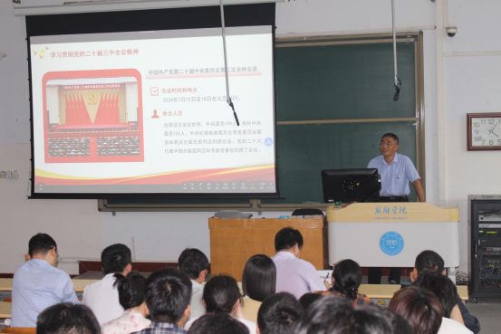 9月24日下午,计算机与信息工程学院、数学与统计学院、3D打印学院、商学院联合举办党的二十届三中全会精神宣讲报告会。特邀马克思主义学院万庆博士作宣讲报告。相关学院领导班子、全体党员以及师生代表参加了报告会。