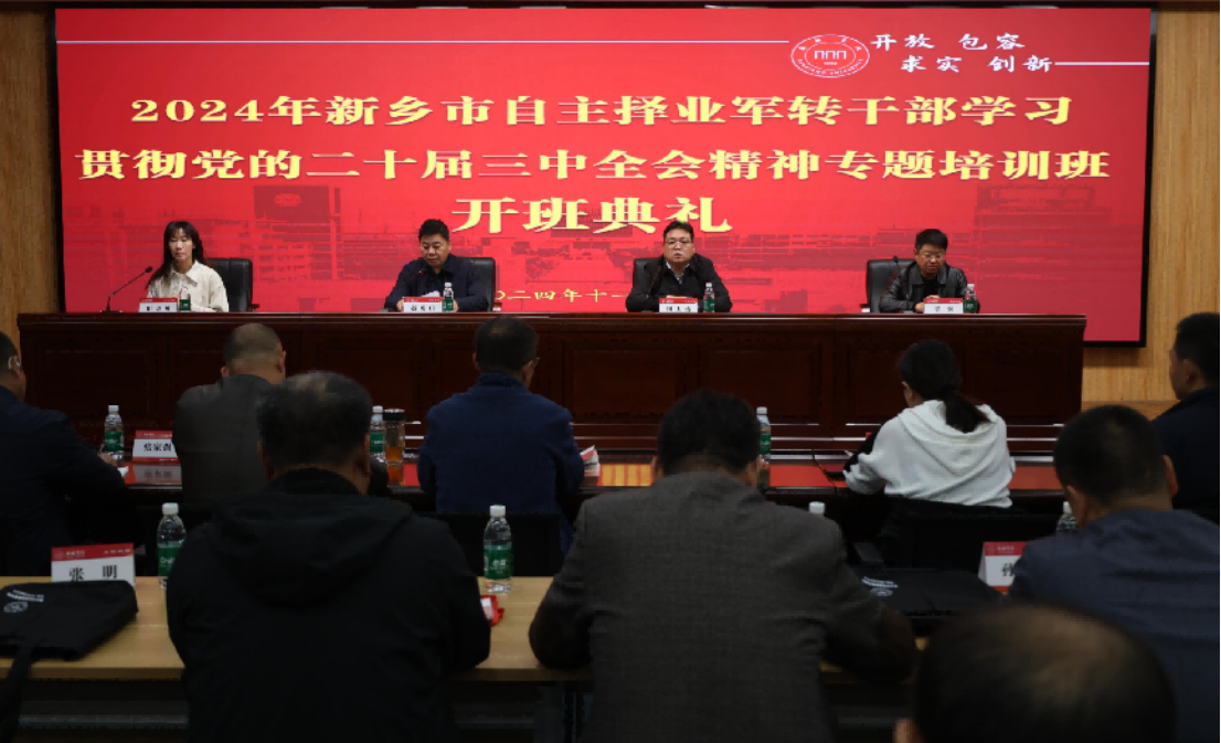 为深入学习贯彻习近平新时代中国特色社会主义思想和党的二十届三中全会精神,强化退役军人思想政治引领,11月4日上午,2024年新乡市自主择业军转干部学习贯彻党的二十届三中全会精神专题培训班在威尼斯官网开班。新乡市退役军人事务局副局长赵虎山、自主择业军队转业干部服务中心主任郭强、威尼斯7798cc继续教育学院院长田大治、副院长田贝贝出席开班典礼,33名自主择业军转干部参加培训。