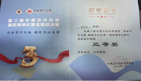 11月11日,由中俄合作办学高校联盟主办,渭南师范学院承办的第三届俄语演讲比赛圆满落下帷幕。此次比赛吸引了来自全国各地高校中俄合作办学项目和机构的46所高校百余名优秀学子参赛。值得骄傲的是,这是国际教育学院学子首次参赛,2022级机械设计制造及自动化(合作办学)专业的申浩东同学在本次比赛中脱颖而出,荣获高年级组三等奖。
