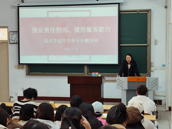 为深入贯彻全国教育大会精神,落实习近平总书记关于青年工作的重要论述精神,突出思想引领,着力培养一批政治强、学习好、思维新、视野广、自律严的大学生骨干。近日,美术学院在A11号楼119教室成功举办学生骨干专题培训班。学院党委副书记李耷、学工办主任沈政、团委书记龚文磊及学院220余名学生骨干参加活动。