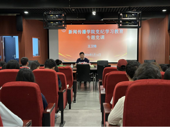 为扎实开展党纪学习教育,切实推动党纪学习教育走深走实,5月14日下午,新闻传播学院党委在A12教学楼五楼审片室开展党纪学习教育系列专题党课活动。党委书记王卫锋围绕新修订的《中国共产党纪律处分条例》,为全体师生党员讲授专题党课。