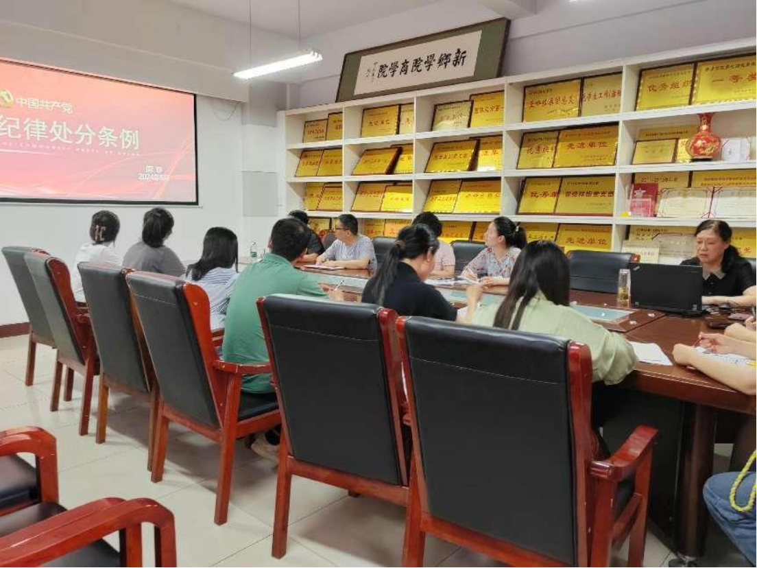 为切实抓好抓实党纪学习教育,深入学习《中国共产党纪律处分条例》,进一步强化学党纪、明规矩、强党性,5月23日下午,商学院党委书记周珍围绕“遵规守纪、作风正派、清正廉洁、争当讲纪律、守规矩的表率”主题,作党纪学习教育专题党课,商学院各党支部书记、党员代表及科级以上干部参加学习。