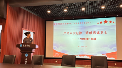 为推动党纪学习教育进一步走深走实,结合《威尼斯7798cc“纪检委员讲<条例>”活动实施方案》要求,5月28日,新闻传播学院党委在A12教学楼五楼审片室开展党纪学习教育系列专题学习活动。党委副书记贾菁以《严守六大纪律,铸就忠诚卫士》为题,为全体师生党员讲授专题党课。